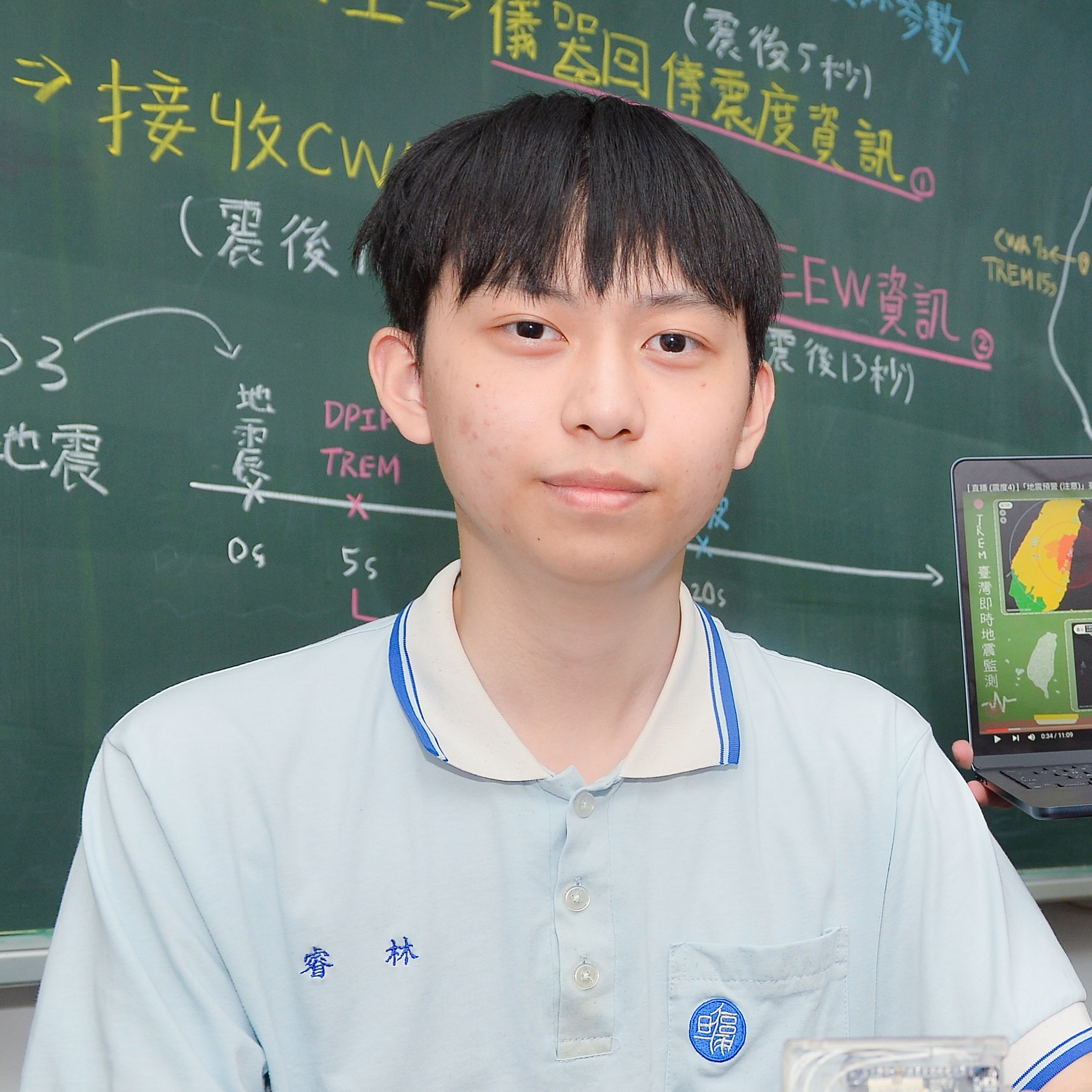2018年目睹大樓地震時傾斜,開始投入地震減災研究,就讀復旦高中期間,和跨校跨齡夥伴,研發出實際測量震度的地震儀,又開發「DPIP災害天氣與地震速報」APP,並和氣象署簽約合作,在0403大地震後廣為下載使用。今年透過特殊選才,進入中央大學地球科學系,未來希望投入研究極端氣候。