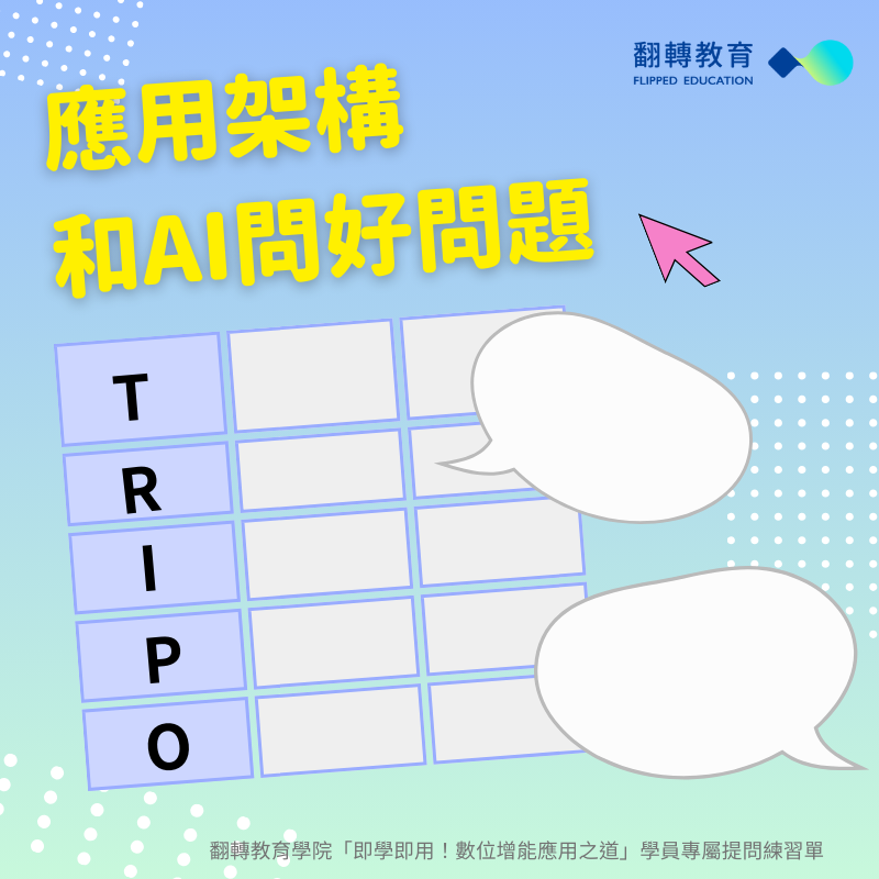 為林穎俊老師編寫,可搭配第一堂直播課運用。內容介紹如何運用架構向AI提問,獲取答案,並邀請學員以不同情境來練習。 |