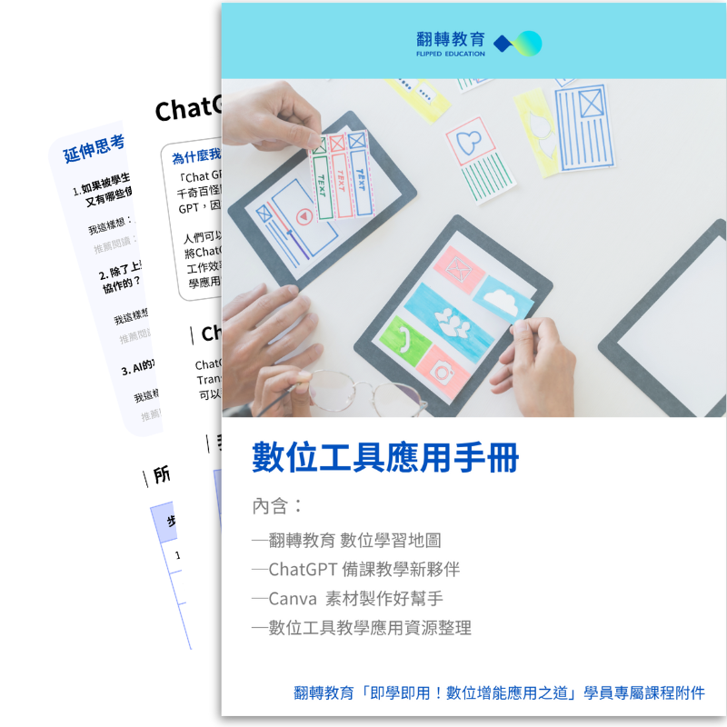 《翻轉教育》將於第一堂課開課前於上課頁面更新課程附件,包含一份數位工具應用手冊及一份學習附件檔案,每堂直播課結束也會整理QA精華筆記上傳至上課頁面。購課者無需額外加購,即可獲得。