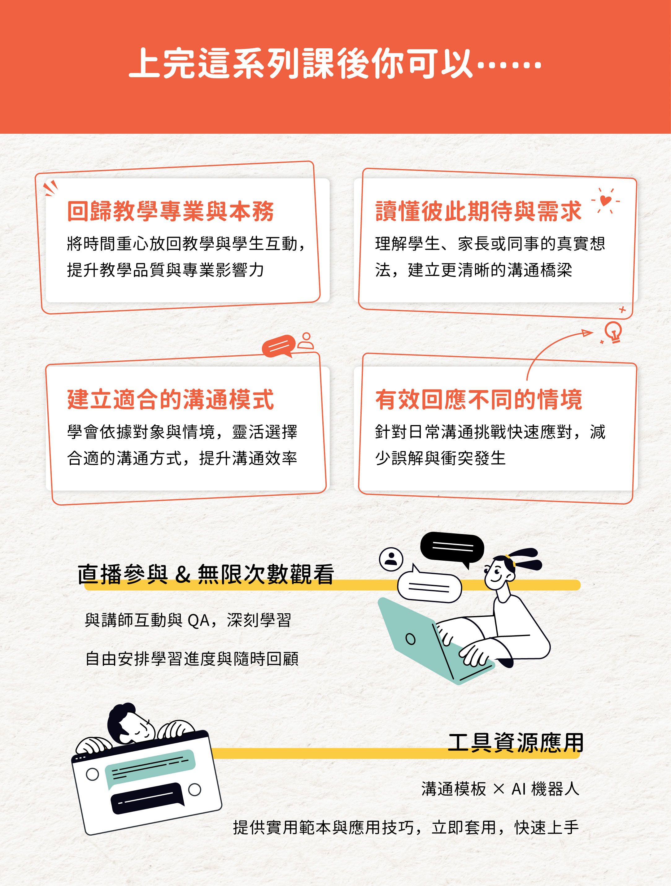 《翻轉教育》將於第一堂課開課前於上課頁面更新課程附件,包含一份AI溝通應用手冊及一份學習附件檔案,每堂直播課結束也會整理QA精華筆記上傳至上課頁面。購課者無需額外加購,即可獲得。
