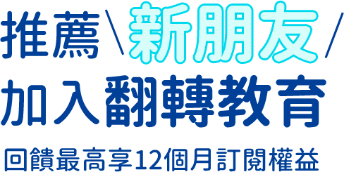 分享推薦翻轉教育給朋友,只要推薦成功,你跟朋友都能再享有額外30天的權益回饋,最高可續延12個月的訂閱權益唷!
